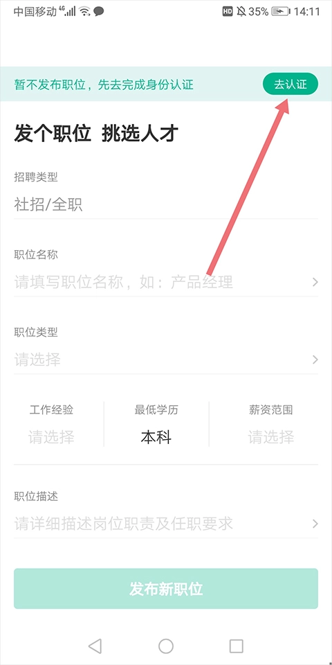 企业Boss、业务部门Leader、HR们都可以在本站免费拉勾招聘,然后安装在手机并打开登录后就可以进入身份认证页面了,在这个页面中企业用户只需要点击【我要招人才】即可在手机上进行企业招聘认证了。
