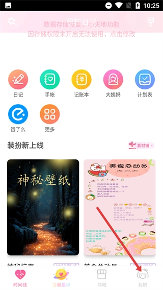 1、在应用主界面,点击底部“我的”选项,进入对应页面,可查看日记、手帐等各类功能入口及装扮内容。