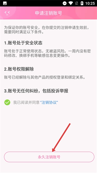 4、在申请注销账号页面,确认满足注销条件并勾选同意“注销协议”后,点击“永久注销账号”按钮提交申请。