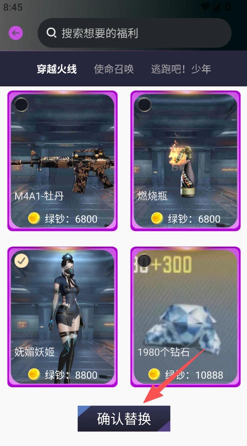 3、挑选对应游戏类别的福利,点击确认替换,即可完成兑换。