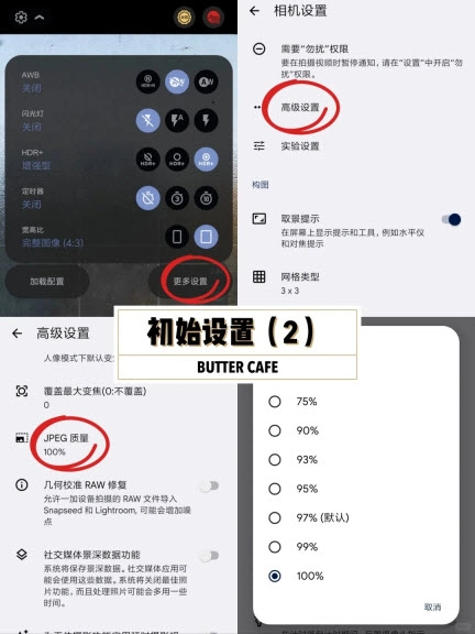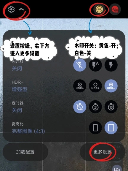 1、打开谷歌相机,点击左上角的齿轮按钮可以进入设置界面,右上角为水印开关-黄色开,白色关