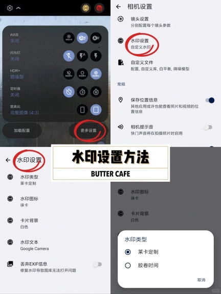 进入【更多设置】-【水印设置】,可自定义水印类型、文本、图标等