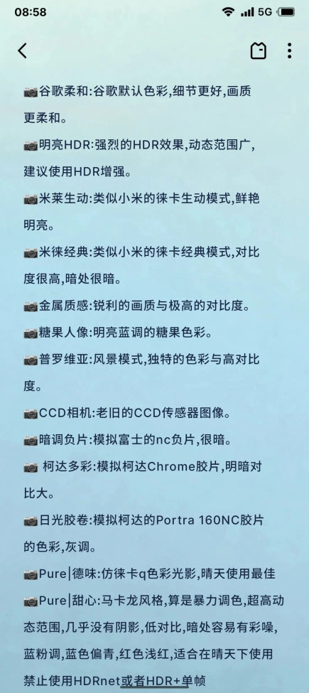 13、Pure甜心:马卡龙风格,算是暴力调色,超高动态范围,几乎没有阴影,低对比,暗处容易有彩噪,蓝粉调,蓝色偏青,红色浅红,适合在晴天下使用禁止使用HDRnet或者HDR+单帧。