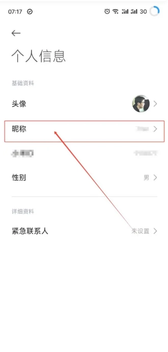 在个人信息页面上,选择【昵称】选项