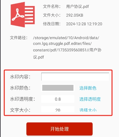 4、设置水印的内容、颜色、透明度等,然后点击“开始处理”按钮。