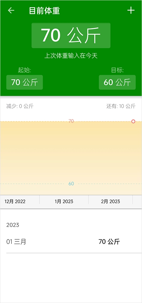 8、进入体重记录页面,可追踪自身的体重变化情况,以此见证健康方面的进步。