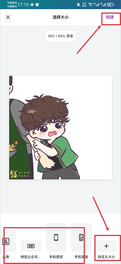 在相册里选好照片后,下一步是挑选图片尺寸;要是下面列出的尺寸都不合适,就能点击自定义尺寸选项;等尺寸选好,点击创建按钮就可以了。
