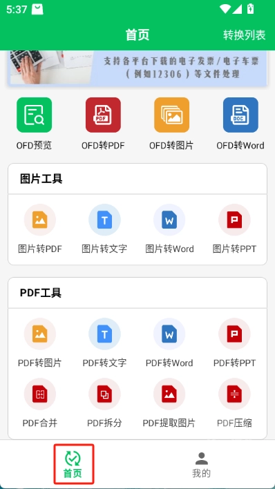 1. 安装并打开ofd电子发票阅读器后,首页会呈现基础的ofd功能、图片工具和pdf工具,若想使用其中某一项,直接点击对应的选项即可。
