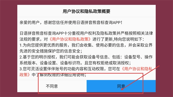 在进入【日语拼音音标查询】功能前,请先阅读【用户协议和隐私政策】的概要内容,点击【同意】按钮后,即可进入应用使用查询服务。