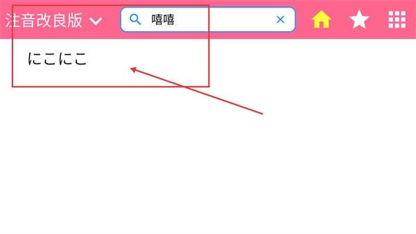 3、在搜索框中输入想要查询的单字(例如【嘻嘻】),应用就会自动展示出该单字对应的日文拼音音标(比如【にこにこ】),这样便完成了单字注音的查询操作。