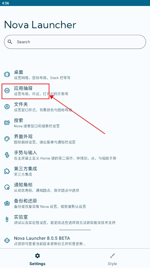 打开,在设置页面点击“应用抽屉”;