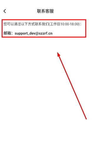 4、可查看工作时间以及客服邮箱(support_dev@szzrf.cn),您可以通过此邮箱与客服取得联系。