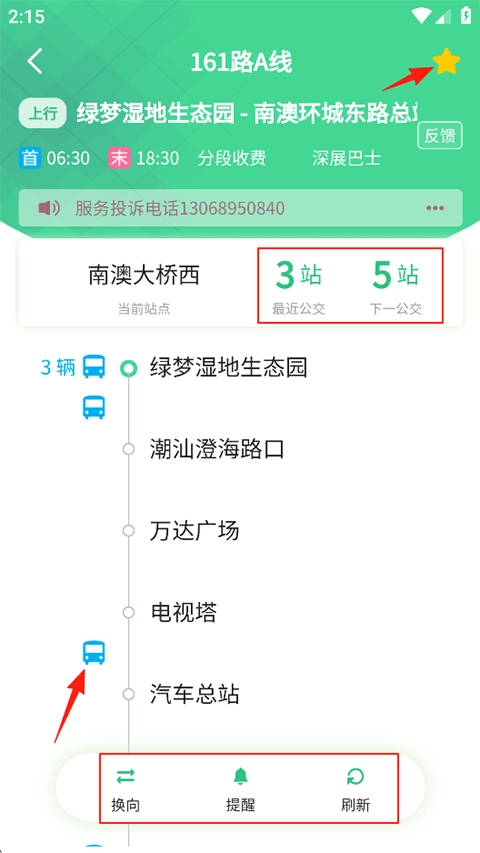 4、能够查看公交车的实时位置和下一站公交的到达时间,下方设有换向、开启下车提醒、刷新车辆等功能按钮,此外,常用路线可点击右上角进行收藏。