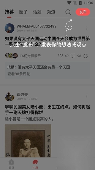 3、返回主界面后,点击“广场”选项,此时界面上方会出现发布提示,你可以通过该功能发表自己的想法或观点。