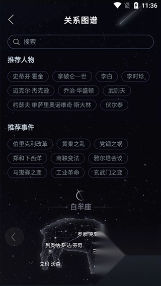 2、点击关系谱图,能够查看更多推荐人物与推荐事件,此外,下方还会以星座的形式呈现历史人物及其相关事迹。