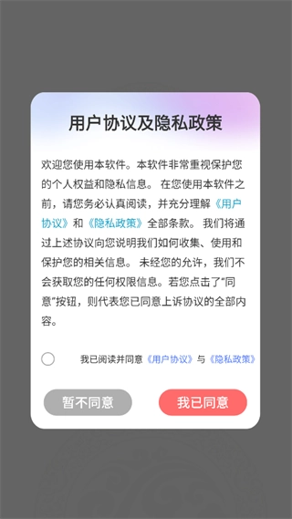 完成安装后,请仔细阅读用户协议与隐私政策,点击“我已同意”按钮,就能进入下一个页面。