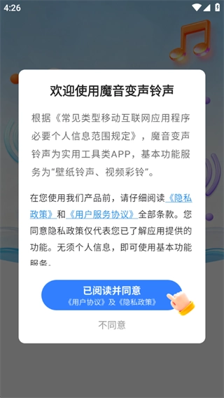 这款铃声软件的用户协议需要大家点击同意才能使用;