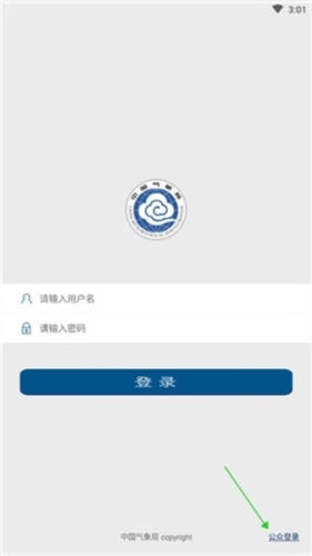 在本站下载并安装中国气象局的应用,打开软件后,点击右下角的公众登录按钮。