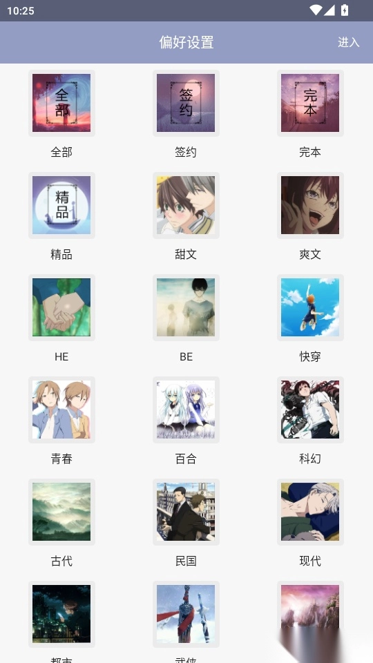 用户在进入小说页面之前,需要先选择自己的小说阅读偏好,然后点击“进入”按钮。