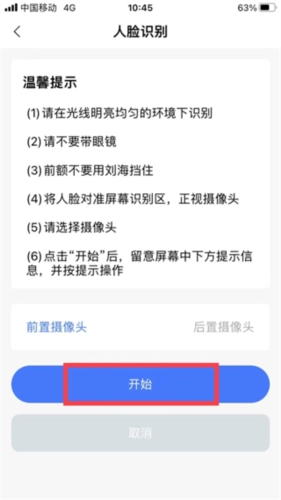 4、根据系统提示,选择“前置摄像头”或“后置摄像头”,点击“开始”进入人脸识别页面,然后根据系统界面提示完成“人脸识别认证”即可。