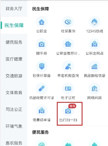 2、在民生保障一栏中点击出行扫一扫按钮;