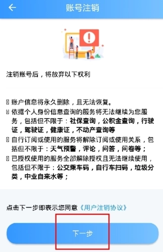 2、在账号注销页面中点击下一步按钮;