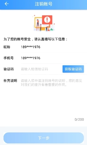 3、填写验证码后,点击“下一步”按钮,即可完成账号注销操作。