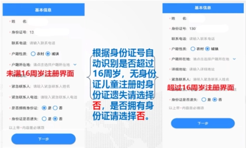 3、系统会依据身份证号自动判断用户是否已满16周岁;对于无身份证的儿童注册场景,若存在身份证遗失情况,“是否拥有身份证”请选择“否”。