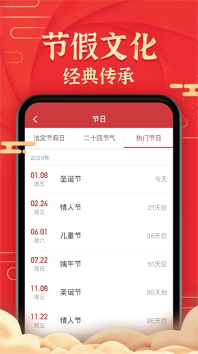 2、节日与节气:涵盖国内外热门传统节日及二十四节气的日期标注提醒,明确国家法定节假日与上班时间的调整说明,更提供详尽的节日科普内容,助力用户了解多元文化。