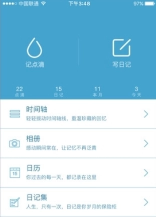 【时间轴】:点滴与日记依时间顺序排列,简洁又不失可爱。