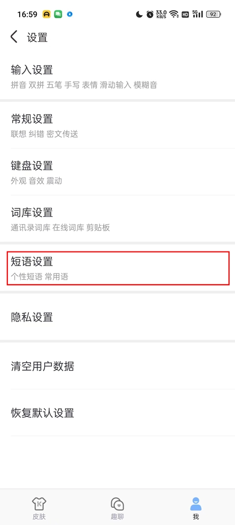 3、进入设置页面后,在页面下方找到“短语设置”选项,点击进入该设置界面。