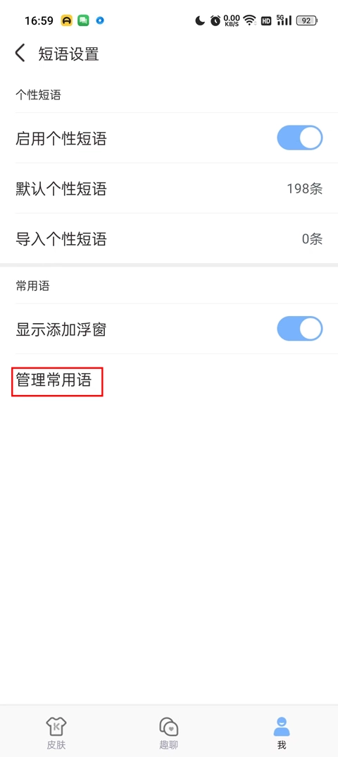 4、在短语设置界面里,存在不少选项,我们可以在下方找到“管理常用语”这一入口并进入;