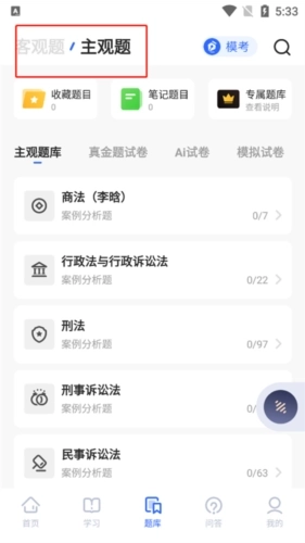 2、里面为用户提供了主观题和客观题两个类别,我们点击主观题,选择自己想要的案例分析、真金题试卷、ai试卷或是模拟试卷;点击进入;