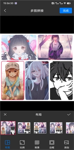 3、多图拼接:可选择多张图片进行拼接操作,并且可调整布局、比例、背景等。