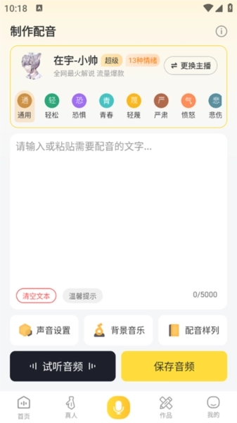 2、在首页的文本框中输入广告文案;点击“更换主播”选项,挑选合适的音色;对情绪风格进行调整后,点击“制作配音”来预览效果;确认效果无误后,点击“保存”按钮,再选择所需的格式将配音导出到本地。