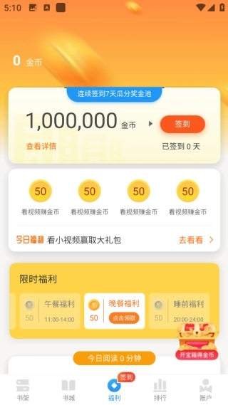 3、在福利板块界面,用户既能点击签到领取金币,也能通过观看视频获取金币。