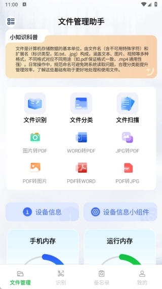1、文件管理页面集成了文件识别、文件分类、文件扫描、图片转PDF、WORD转PDF、JPG转PDF等功能;