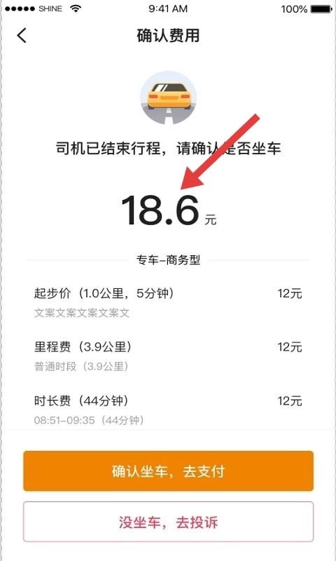 3、费用确认页面,行程结束后会直观展示费用明细,起步价、里程费、时长费等大项均进行拆分呈现,同时并列设置“确认乘车支付”与“未乘车投诉”两个按钮,以此规范行程收尾的流程。