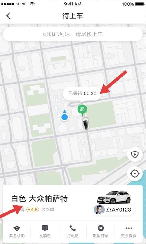 2、待上车页面的地图上清晰显示司机位置和预计等待时长,车辆信息包含车型、车牌,以及司机的评分和订单数量,同时提供紧急求助、发送消息等功能入口,从多维度辅助司机与乘客实现高效对接。