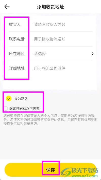 4、来到添加页面,依次填入姓名、电话、地区以及地址,之后点击【保存】按钮。