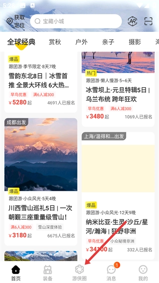 1. 您可以打开游侠客App,进入首页后,点击底部的【游侠圈】。