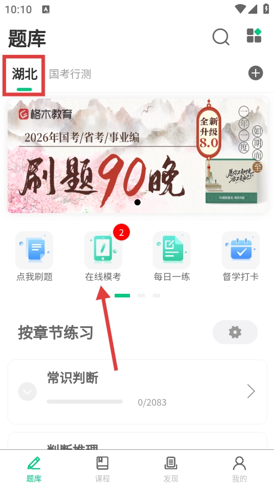进入应用后,找到标有“题库”的界面,在该界面内点击“在线模考”选项。