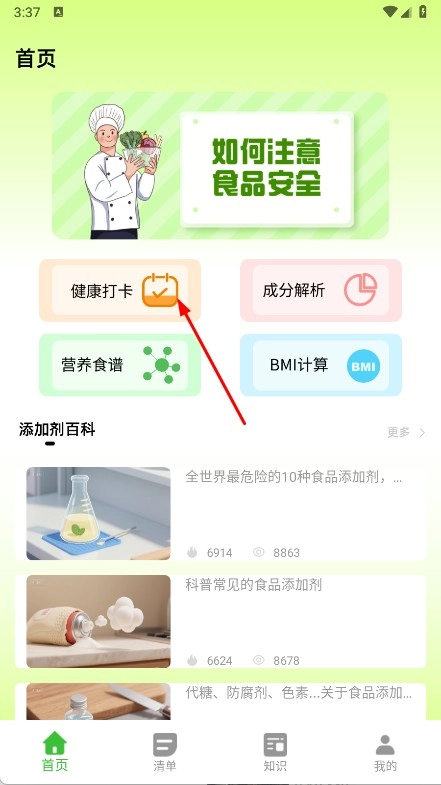 确认运动消耗的热量数值后点击确定,完成运动打卡;同时可了解食品添加剂百科,掌握食品安全科普知识。