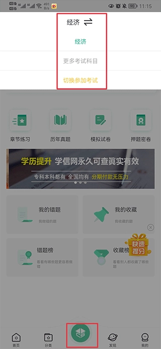 启动才士题库应用后,进入带有学士帽标识的页面,找到页面内的切换相关按钮,点击该按钮后选择查看更多考试科目选项,或直接切换至考试参与界面。