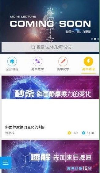 启动乐学高考应用后,在首页的“全部课程”板块中,你能找到高中数、理、化三科的高考考点专项视频。这些内容聚焦高频考点,由资深教师团队打造,通过精炼的解题技巧讲解,帮助学生快速掌握应试方法,最高可让答题效率提升至原有水平的四倍。