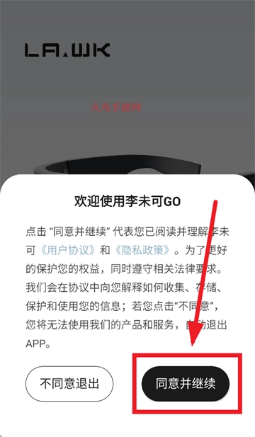 安装并启动李未可go应用程序,当出现“欢迎使用李未可GO”的提示界面时,点击“同意并继续”按钮。