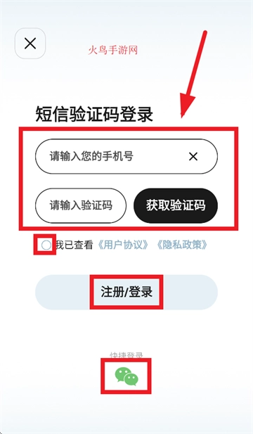 跳转至登录界面后,输入手机号和验证码,勾选“我已查看《用户协议》《隐私政策》”,点击注册/登录按钮即可完成操作,此外也支持微信快捷登录方式。