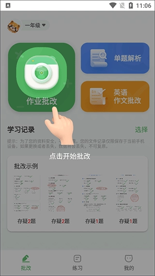在首页能看到作业批改、单题解析、英语作文批改这些功能,点击“开始批改”按钮即可使用。