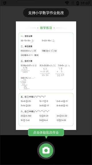 对着需要批改的作业拍照(目前仅支持小学数学作业的批改)