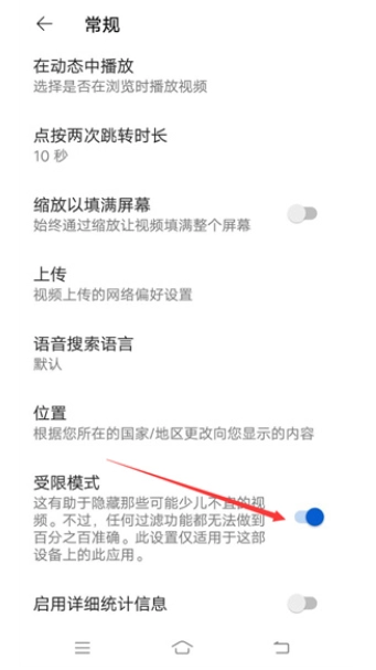 界面底部有个“受限模式”开关,点一下就能切换状态——蓝色时是开启,灰色则表示功能已关闭。
